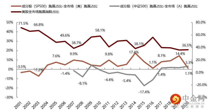 图2:美国指数成分股是赢家的概率大于中国,因而超额更难做