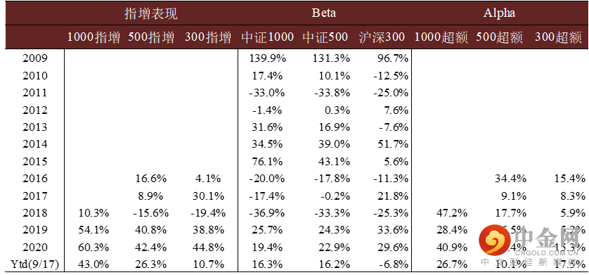 指增是最近几年才出现的基金产品,主流品种可以分为300指增和500指增,近两年又出现了1000指增等新品种。从指数增强整体表现来看,500指增强于300指增,1000指增整体表现又强于前两者。先考虑300指增和500指增,在小盘强于大盘的年份,比如今年,不难理解为什么500指增表现优于300指增。但即使在沪深300跑赢中证500的年份(2016、2018 ~2020年),500指增也不逊色于300指增。主要原因在于目前小盘指增超额收益显著大于大盘指增,多的超额大概率能够弥补中证500指数跑输沪深300的幅度,因此整体仍然是小盘指增占优。唯一的例外是2017年,大盘指数大幅跑赢小盘,beta差距过大(20%+),使得300指增强于500指增。