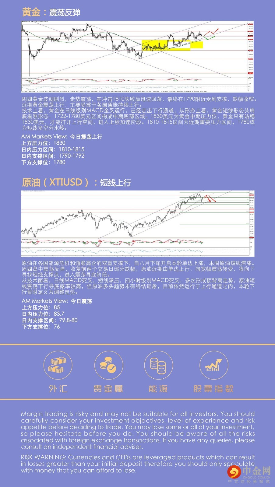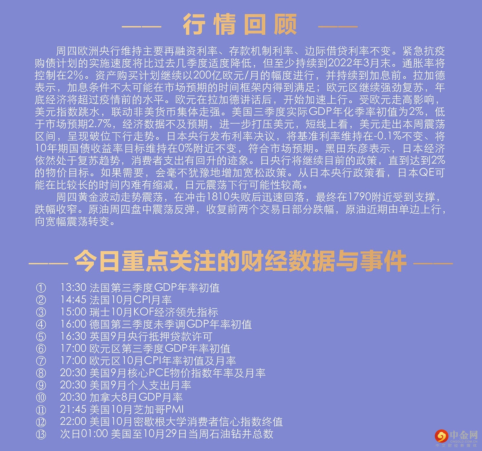 周四欧洲央行维持主要再融资利率、存款机制利率、边际借贷利率不变。紧急抗疫购债计划的实施速度将比过去几季度适度降低,但至少持续到2022年3月末。通胀率将控制在2%。资产购买计划继续以200亿欧元/月的幅度进行,并持续到加息前。拉加德表示,加息条件不太可能在市场预期的时间框架内得到满足;欧元区继续强劲复苏,年底经济将超过疫情前的水平。欧元在拉加德讲话后,开始加速上行。受欧元走高影响,美元指数跳水,联动非美货币集体走强。美国三季度实际GDP年化季率初值为2%,低于市场预期2.7%,经济数据不及预期,进一步打压美元,短线上看,美元走出本周震荡区间,呈现破位下行走势。日本央行发布利率决议,将基准利率维持在-0.1%不变、将10年期国债收益率目标维持在0%附近不变,符合市场预期。黑田东彦表示,日本经济依然处于复苏趋势,消费者支出有回升的迹象。日央行将继续目前的政策,直到达到2%的物价目标。如果需要,会毫不犹豫地增加宽松政策。从日本央行政策看,日本QE可能在比较长的时间内难有缩减,日元震荡下行可能性较高。 周四黄金波动走势震荡,在冲击1810失败后迅速回落,最终在1790附近受到支撑,跌幅收窄。