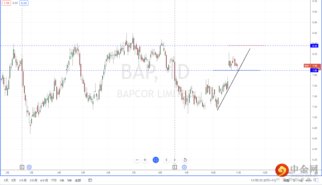 BAP:由于目前市场反复性较大,在ETF产业的表现迹象再次拐头上行,但市场上行动能不足。从BAP目前趋势在前期向上跳空后进入调整阶段中,短期价格也回测上升趋势线附近。整体格局处于在多头阶段中,下方水平支撑带在7.89附近。可适当关注价格调整后继续上行的多头机会,上方目标位置参考8.36一带。