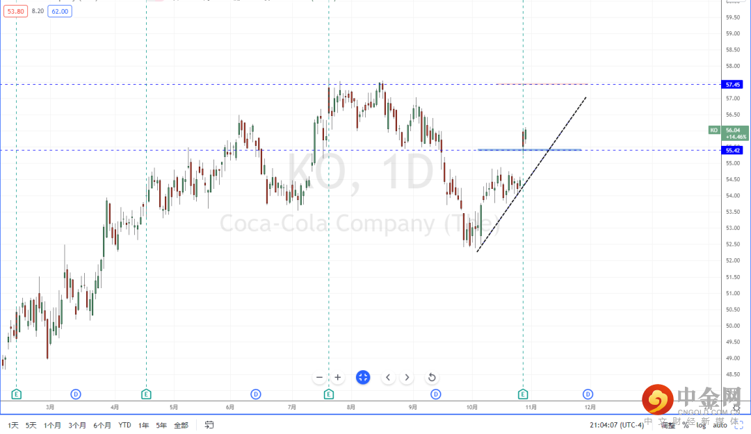KO:目前行情在向上跳空后继续起稳,整体趋势处于在多头格局中。下方有上升趋势线的支撑作用,其水平支撑带在55.42附近。由于近期市场再次趋于偏多,短期可适当关注价格调整后继续上行的多头机会,上方区间目标位置参考57.45附近。