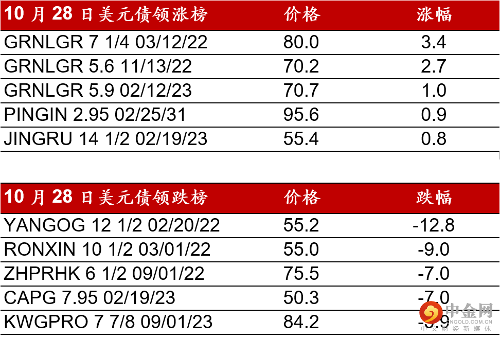 昨日(10月28日),中国高收益债券市场情绪再次走弱,大部分债券均见显著跌幅。佳兆业领跌市场,再次下挫约2-8pts。其他债券如融信/阳光城下跌约7-10pts,奥园/禹洲/正荣/合景泰富下跌约2-7pts。受较弱情绪波及,较好评级债券也见不同程度跌幅。世茂下跌约2-4pts,龙光/旭辉也下跌约2-3pts。广汇汽车公布逊于预期的第三季度财报,债券下跌6-8pts。