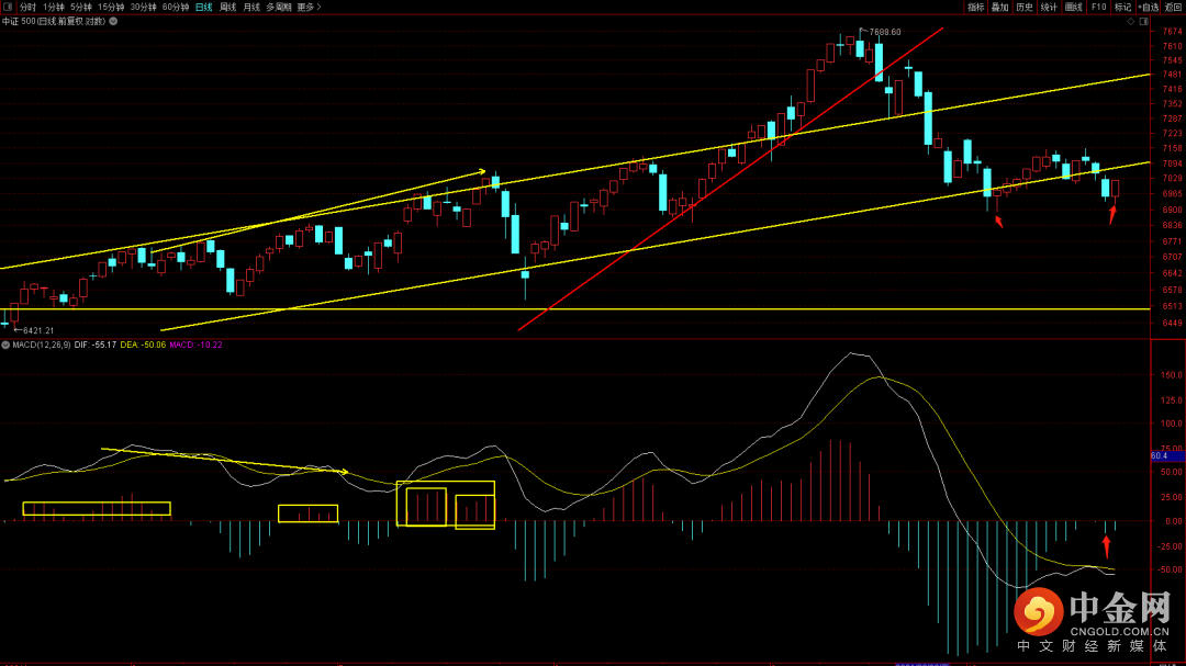 中证500虽然收出阳线,但短期调整大概率会继续维持,这个反弹只是对短期的一个修复走势,大概率在后续行情中还会去触碰前期低点,关注底分型的结构何时出现。