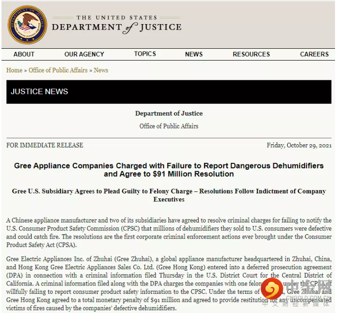 近日,据多家媒体报道,美国当地时间10月29日,美国司法部在官网上发布消息称,格力和美国司法部达成延迟起诉协议(DPA)。根据DPA的条款,珠海格力和香港格力同意接受总额为9100万美元(约合5.8亿元人民币)的罚款,并同意向因公司有缺陷的除湿机而引起火灾的任何未获赔偿的受害者提供赔偿。