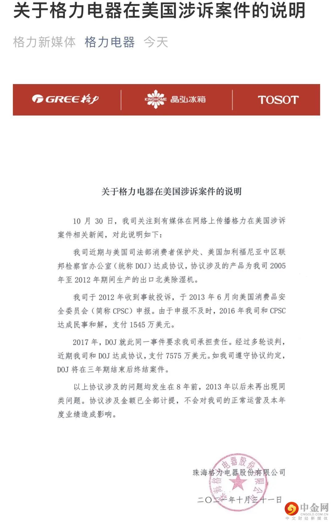 格力电器官方微信公众号10月31日早间发布声明称,公司近期与美国司法部消费者保护处、美国加利福尼亚中区联邦检察官办公室(统称DOJ)达成协议,协议涉及的产品为公司2005年至2012年期间生产的出口北美除湿机。
