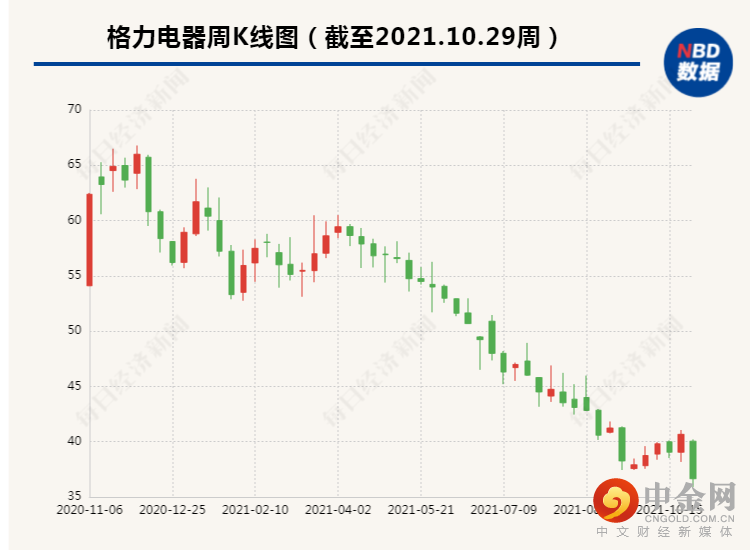 10月28日,格力电器股价报收36.5元/股,再创两年内新低。29日股价略有回升,收盘报36.65元/股。截至目前,格力股价年内跌幅达38%,市值自高位蒸发1800亿元。