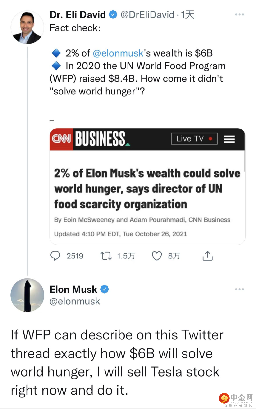 马斯克在推特上写道:如果世界粮食计划署能够在这个推特帖子上准确描述 60亿美元将如何解决世界饥饿问题,我将立即出售特斯拉股票来捐赠。