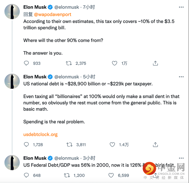 马斯克对此也是频频提出质疑,还曾连发数条推特吐槽驳斥“亿万富翁税”。他列举道:美国联邦政府的负债率在2000年时是56%,现在已经升至126%且仍在迅速攀升。目前美国国债规模为28.9万亿美元,平均下来,每位纳税人需要负担22.9万美元。