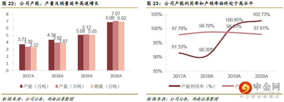 公司2018年开始给晶科能源批量供应光伏铝边框产品,2018-2020年对晶科能源的销量分别为0.43、0.63、1.54万吨,销售额分别为0.75、1.09、2.85亿元,呈快速增长趋势。产能供不应求,上市增强资金实力步入发展快车道。2017-2020年,公司产能保持较快增速,由3.71万吨增长到6.88万吨。随着公司上市增强资金实力,降低融资成本,有望破除产能限制,步入发展快车道。