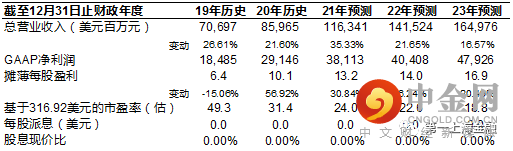 我们预计21-23年收入分别为1,163.4、1,415.2和1,649.8亿美元,对应增速分别为35.33%、21.65%和16.57%。我们下调2021-2023年利润至381.1、404.1和479.3亿美元,对应增速分别为30.84%、6.24%和20.49%。采用DCF法估值,下调目标价至409.48美元,维持买入评级。