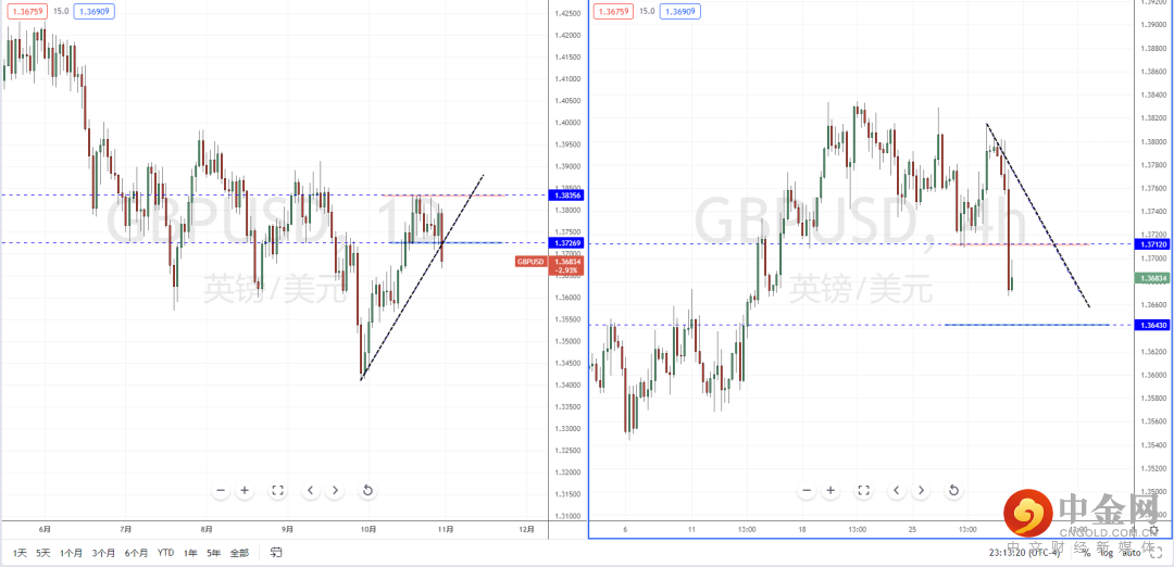 镑美天图:目前行情在上冲后坚决破位,从趋势角度价格短期有跌破上升趋势线与水平支撑带1.37269附近。短期趋势有破位但需要进一步确认,从日内4小时级别,可适当关注价格回测上方压制后的表现。如果受阻则继续保持空头方向,反之,则可能继续反弹上行。