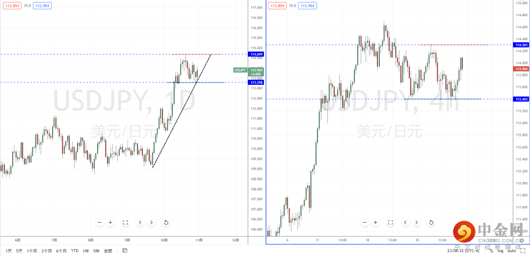 美日天图:目前趋势继续处于在相对高位区间阶段调整,整体格局趋于多头方向。下方有上升趋势线的支撑作用,其水平支撑带在113.928附近。从日内4小时级别,趋势也在窄幅区间内调整后继续上行。但上方空间幅度有限,可适当关注价格调整后继续上行机会,目标位置参考前期高点附近。