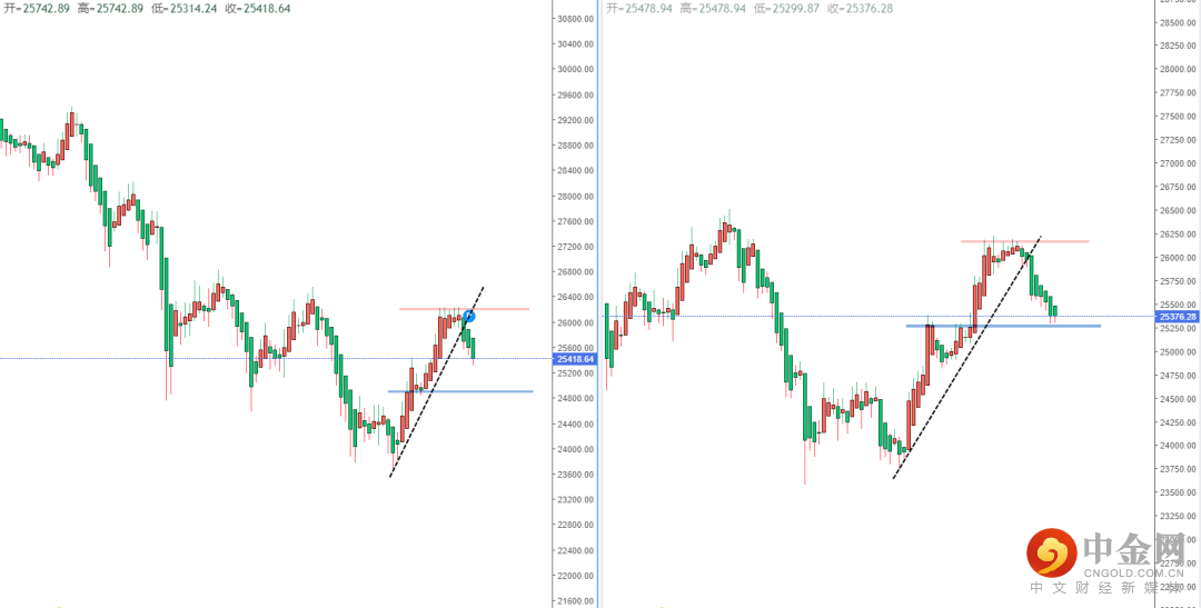 恒生指数天图:目前行情在上方水平压制带25250.61附近受阻后下行,并且短期价格有跌破上升趋势线的支撑作用。现阶段整体趋势趋于偏空,从日内4小时级别,可适当关注价格在短期支撑区域附近的表现。如果破位将继续下行,下方目标位置可参考25013.49一带。