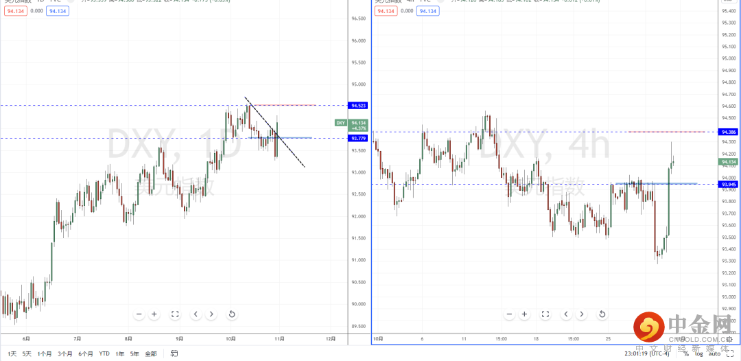 美元指数天图:短期价格在破位之后再度起稳,并且价格也回测压制带93.779上方形成支撑作用。由于趋势极端表现,从日内4小时级别,虽然价格有效突破上行,但短期不宜追多。可等待趋势适当修正后,关注后期向上的多头机会。