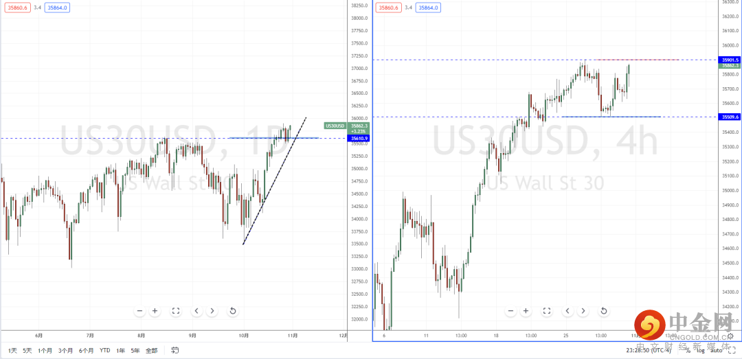道琼斯指数:目前行情继续保持多头方向,价格在关键支撑区域35610.9附近纠结后继续上行,下方有上升趋势线的支撑作用。从日内4小时级别,价格也即将触及前期高点附近。可适当关注价格调整后再次上行的多头机会,其目标位置参考周线前期高点附近。
