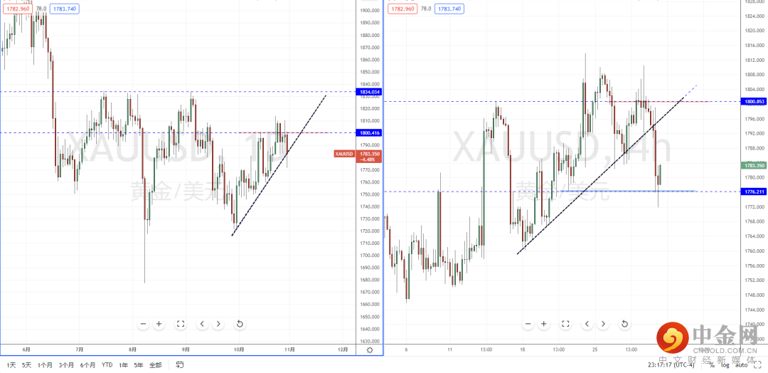 黄金天图:目前行情在冲击上方水平压制带附近继续受阻下行,但价格正处于测试上升趋势线附近,上方水平压制带在1800.416附近。从日内4小时级别,价格在极端下行之后止跌迹象。可适当关注价格调整后继续反弹上行机会,上方目标位置参考1792.265附近。