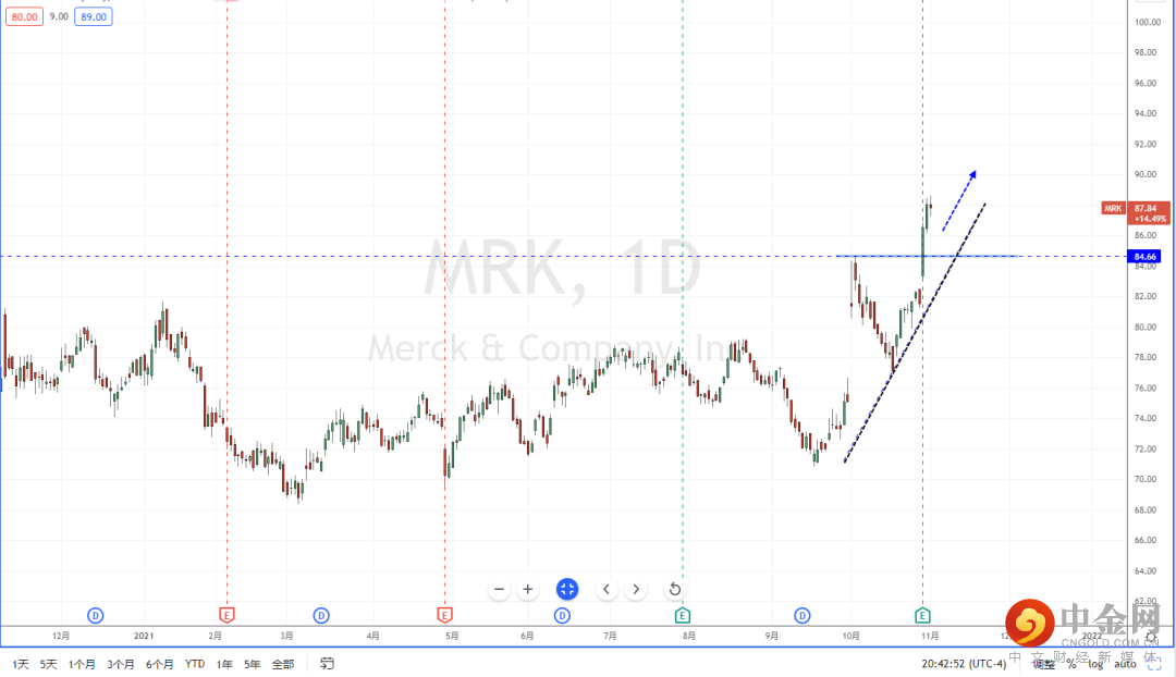 MRK:目前行情在生物科技ETF产业转势上行阶段下,MAR再次突破前期高点。并且也站上打开上方多头空间。整体格局目前保持多头格局,下方有上升趋势线的支撑。短期可适当关注价格调整后继续上行的多头机会,上方目标位置参考周线前期高点附近。