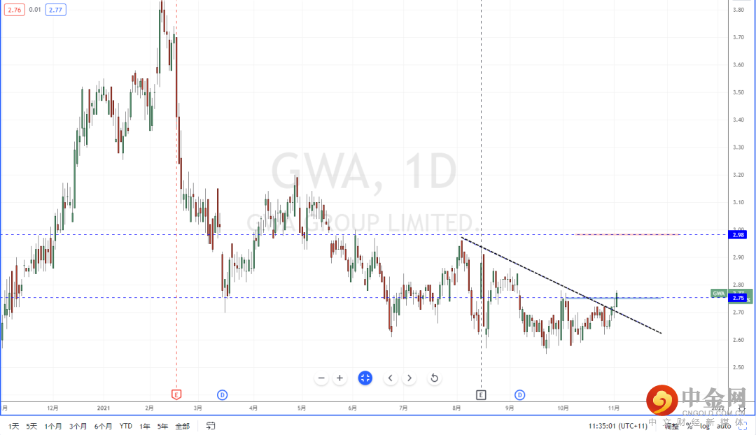 GWA:在市场继续上行之际,各产业以及个股也有明显的拐头向上的迹象。从GWA目前整体趋势表现,在前期相对底部区间纠结盘整后短期价格也一度有效突破下降趋势线的压制以及水平压制带2.75附近。并且上方多头空间已经打开,可适当关注价格调整后继续向上的多头机会,上方目标位置参考2.98附近。