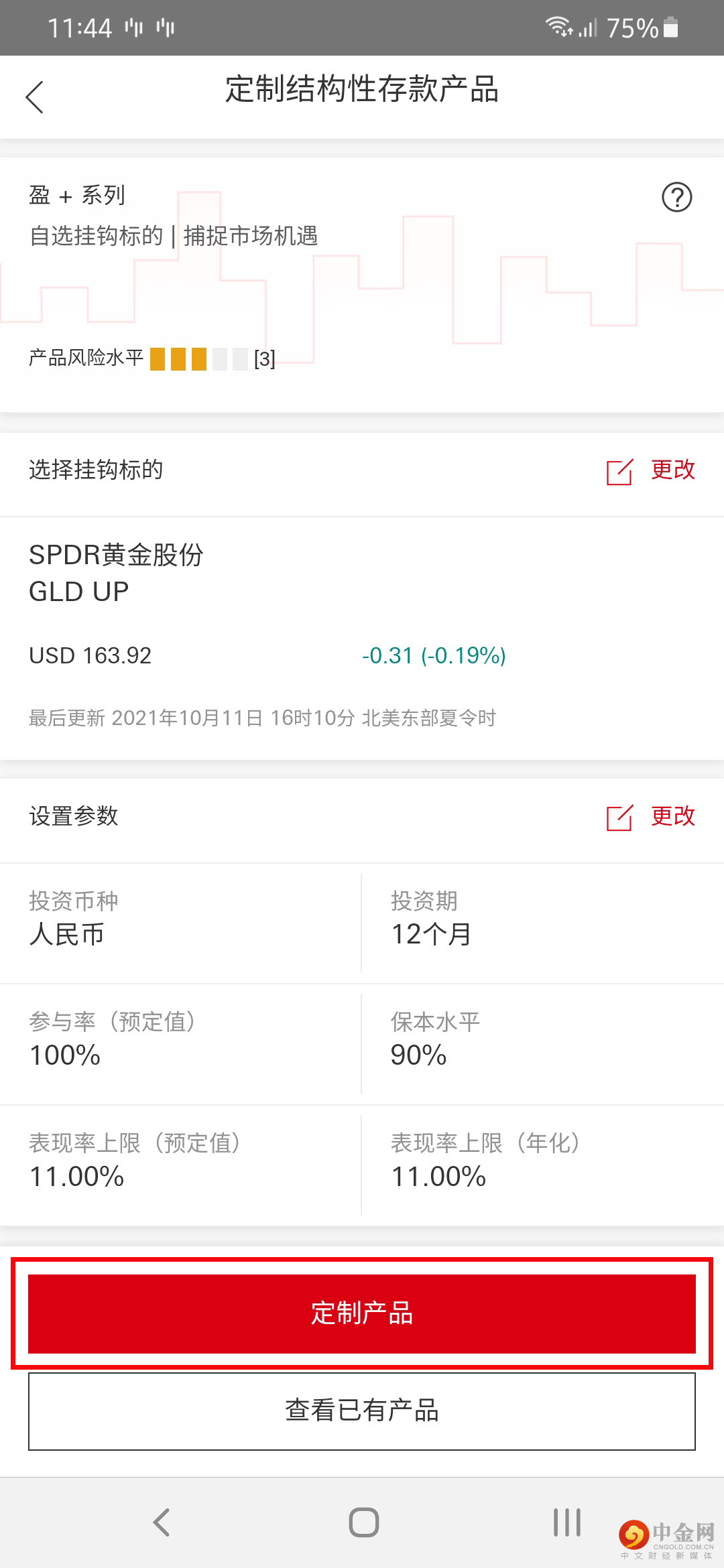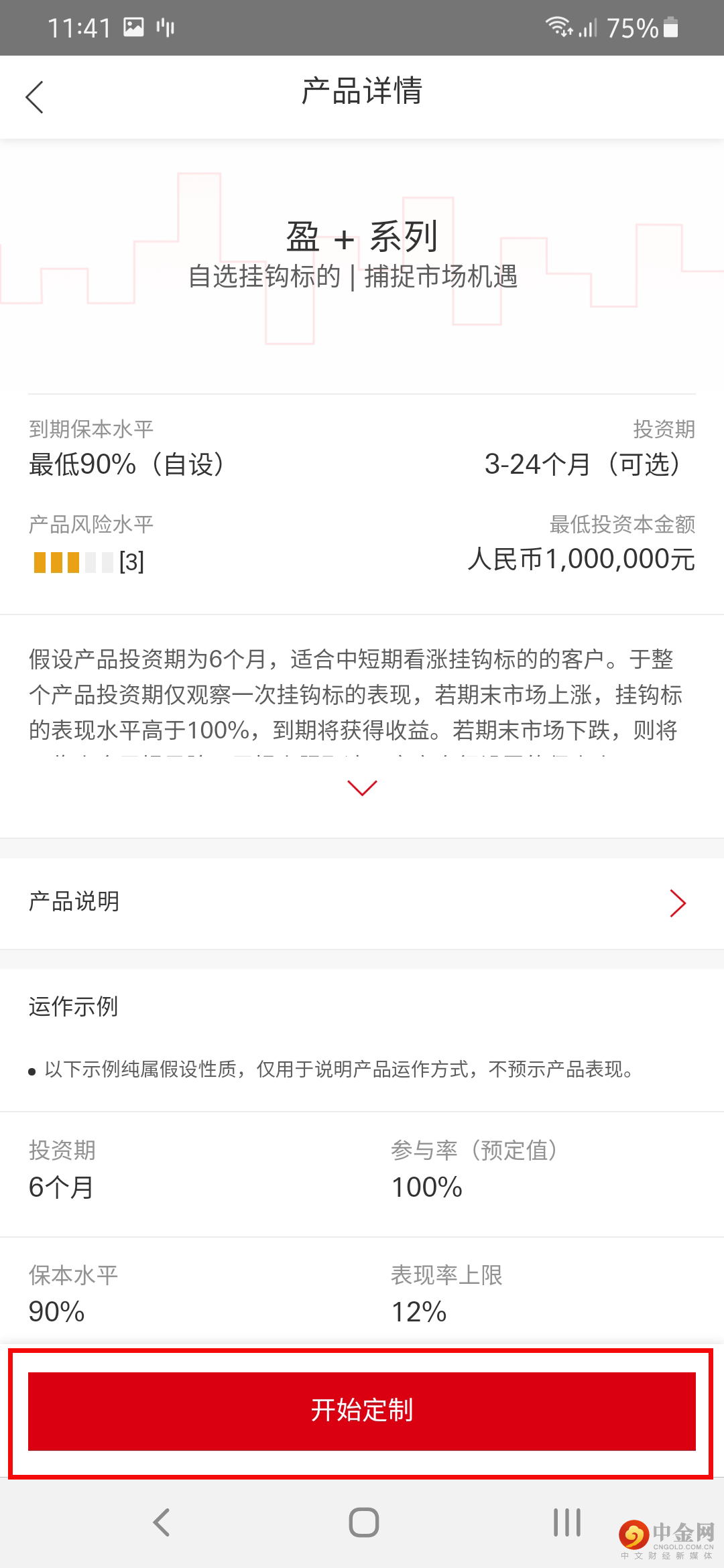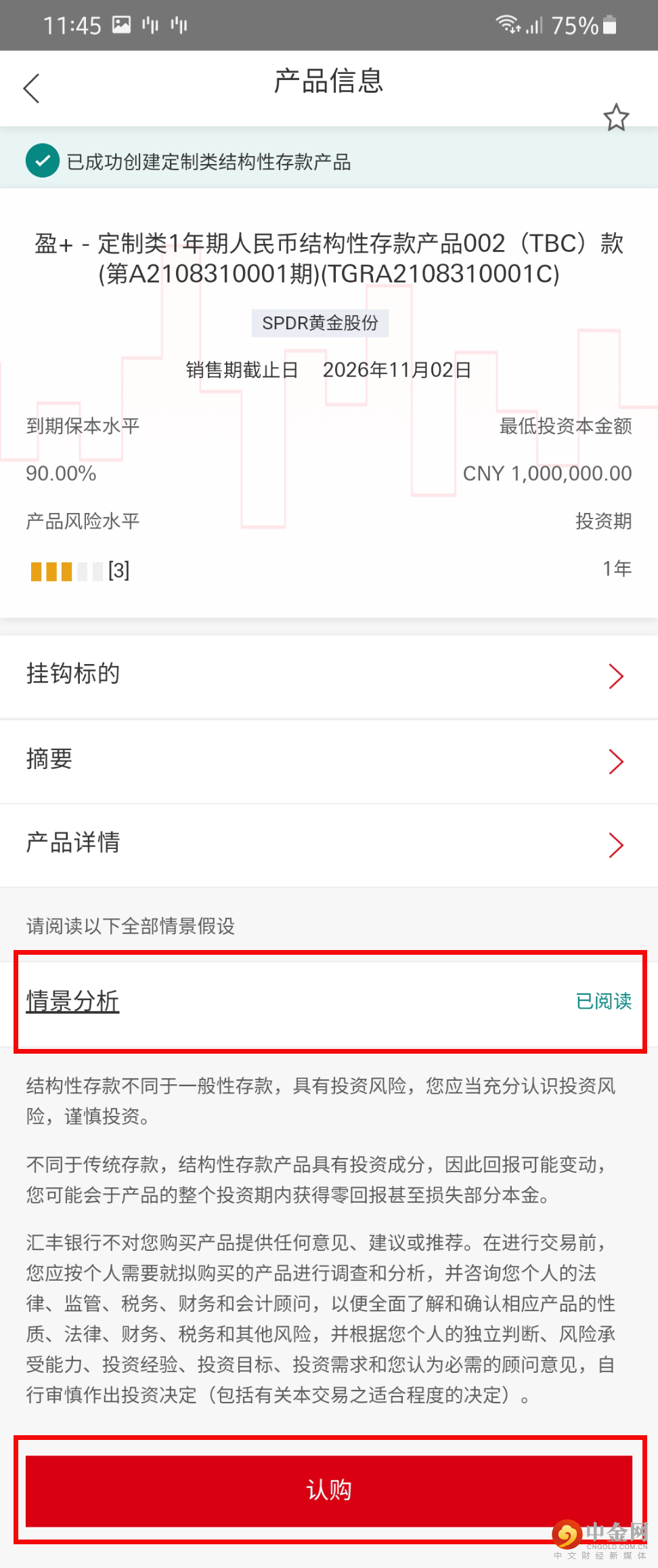 确认设置,点击“定制产品”按钮,进入产品创建页面。成功创建定制类产品并点击完成“情景分析”及其他产品信息的阅读之后,即可点击“认购”按钮进行认购。