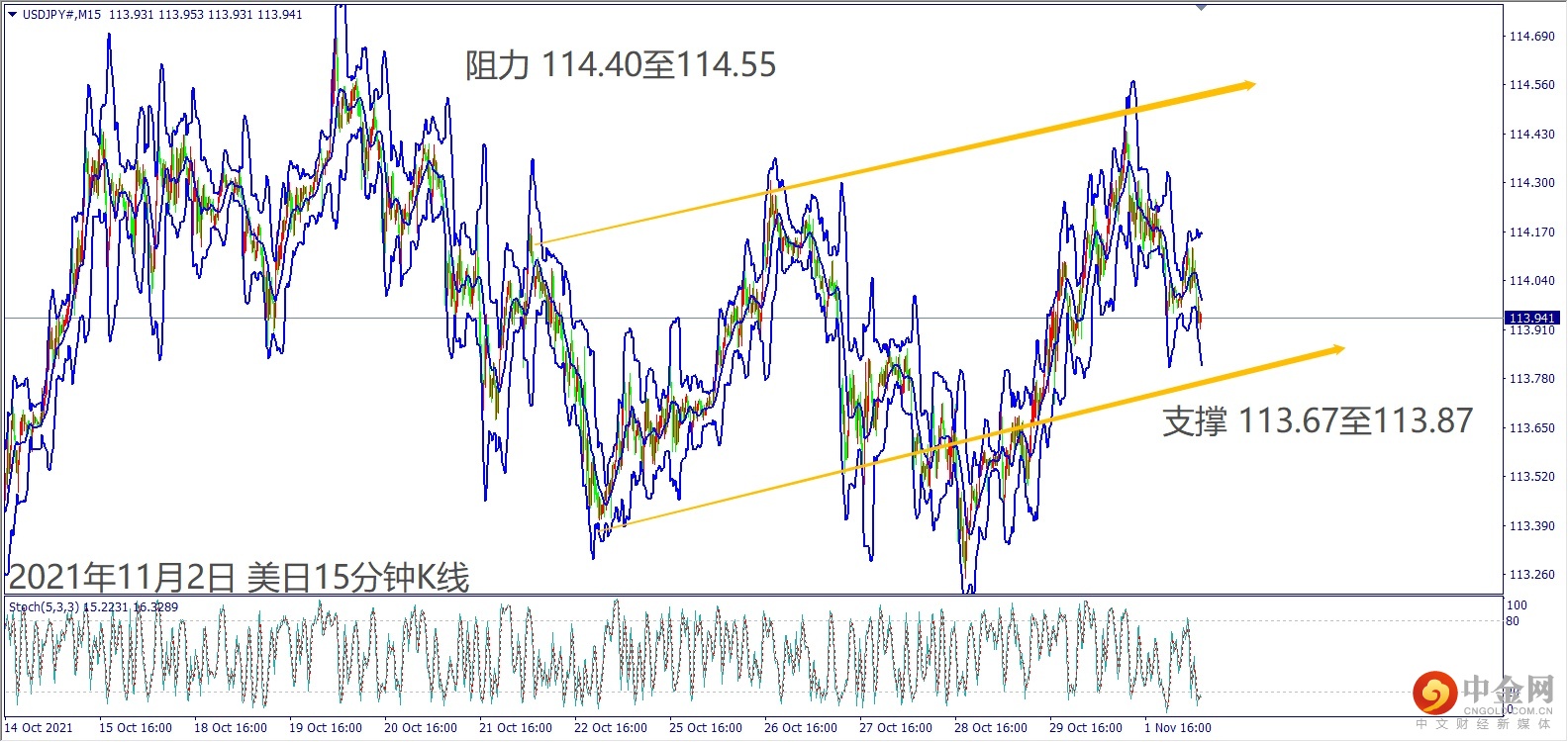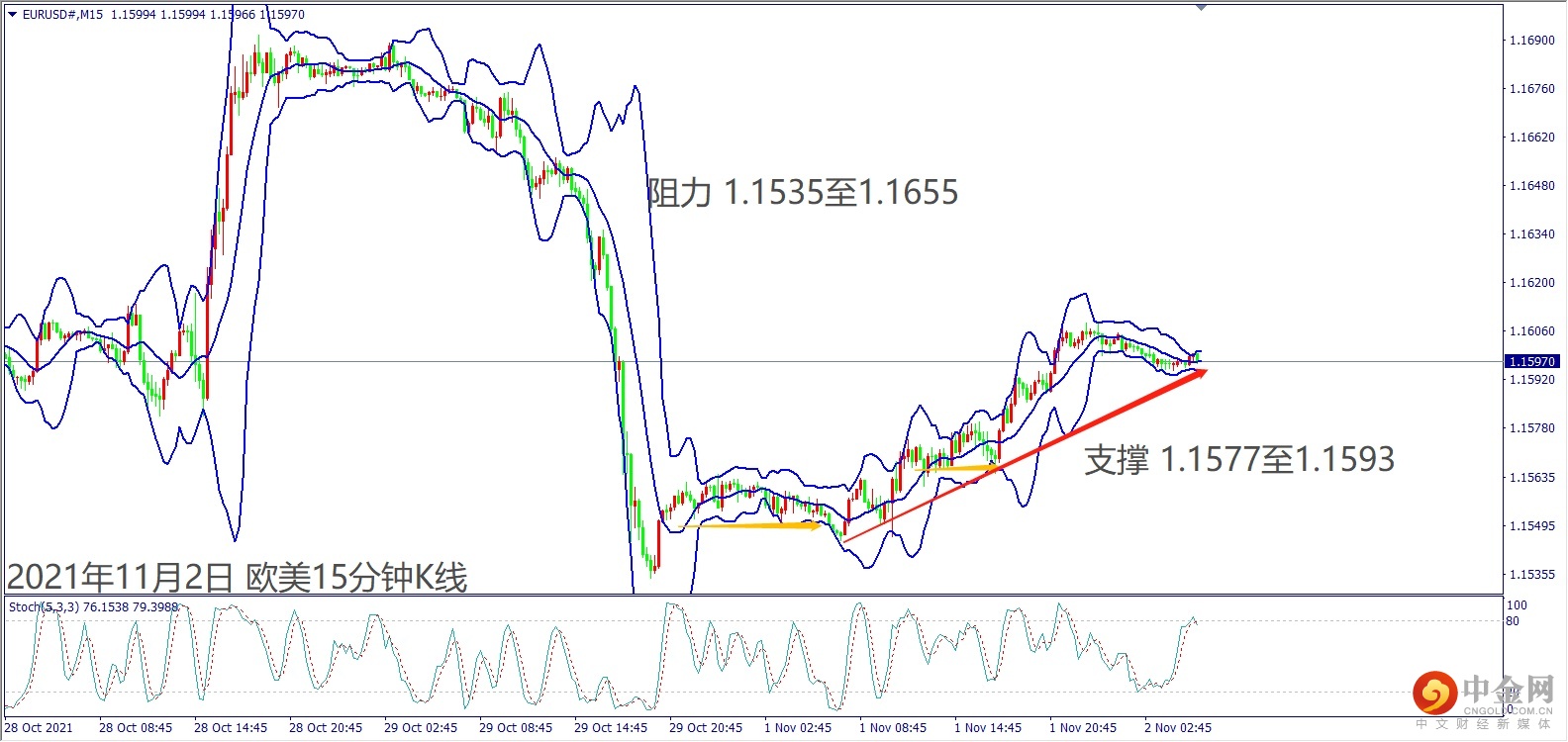 日级别线图,长阳烛收复前日一半跌势,1.1600关口若守稳,有望重回涨势;15分钟K线,短线形成盘涨,守住上升趋势线,大有可能挑战上方阻力。