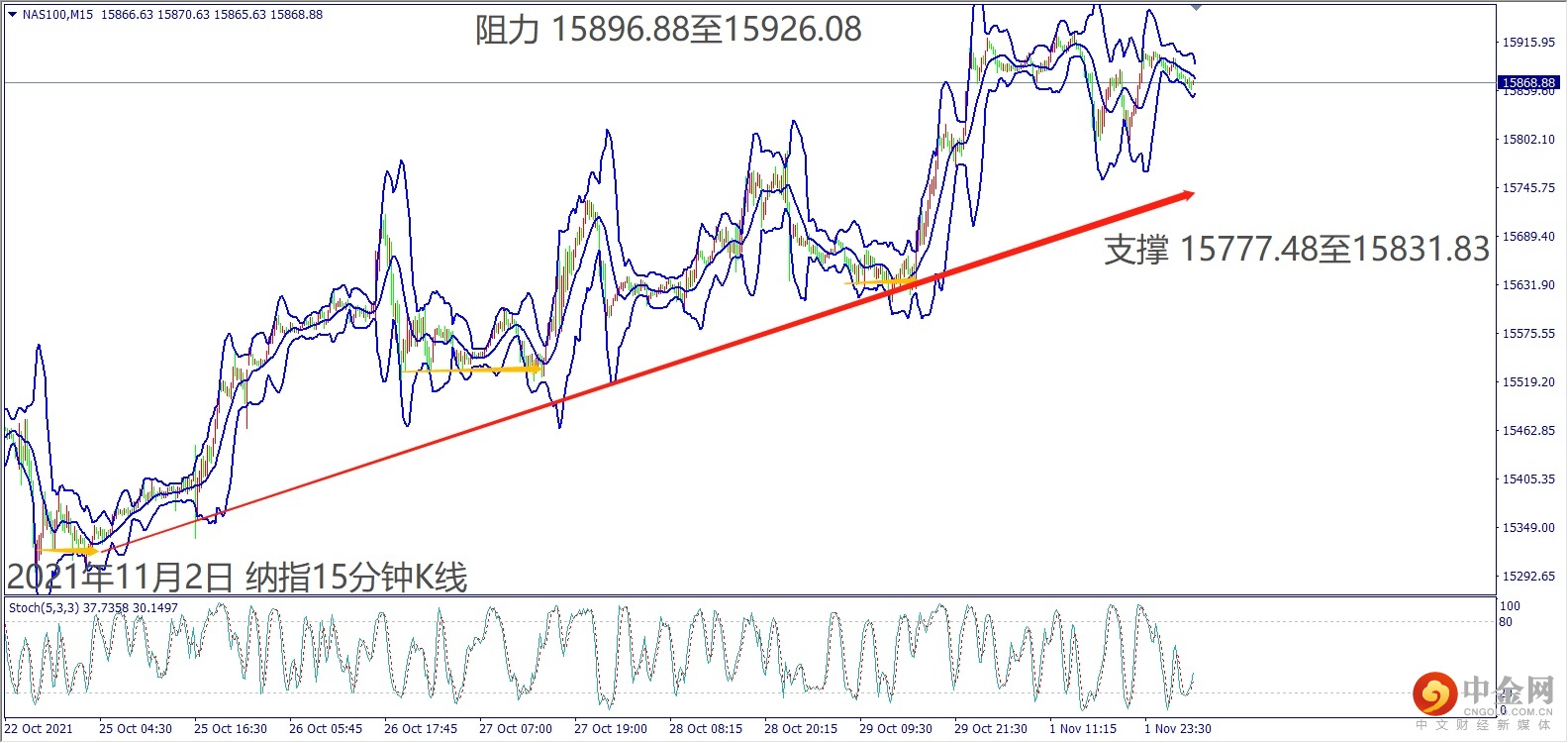美国基建法案在参众议院多数党领袖达成共识,近期持续推升道琼斯和纳指冲历史新高。预计欧元区公布制造业数据大都好于市场预期,道琼斯一旦突破小时布林带中轨35,913,建议可偏多操作。短线纳指处于震荡,若顺利突破盘整顶部15,918,建议可偏多操作。