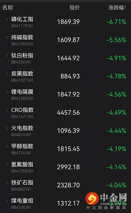 跌幅榜上,钢铁、煤炭、石油、有色等周期板块领跌。