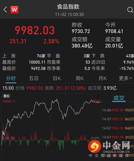 5000亿的海天味业涨6.3%。3000亿的金龙鱼也涨超6%。不过,白酒板块却跌幅不小,指数跌超2.5%,金种子酒跌9.93%,泸州老窖跌3.11%。