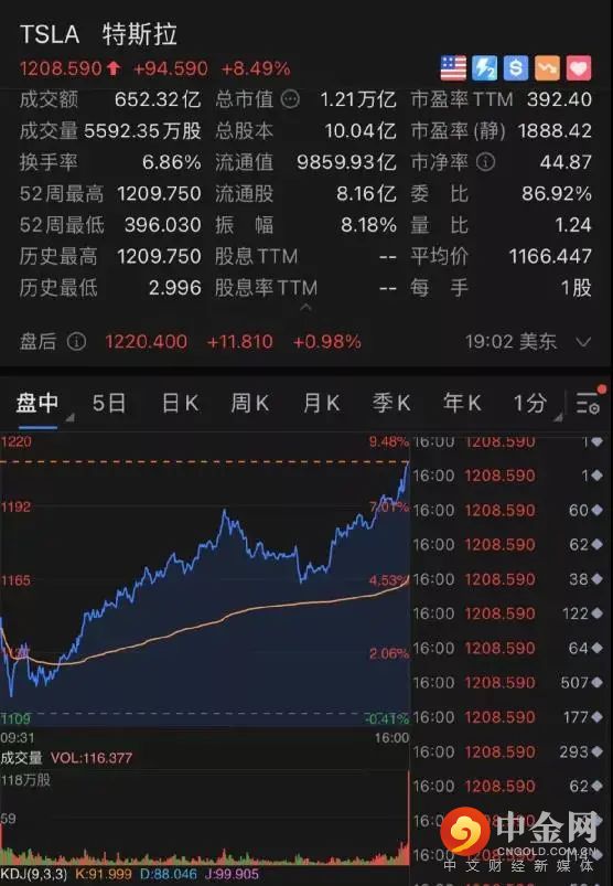 特斯拉大涨8.5%,市值飙升6000亿,连续第四个交易日创新高
