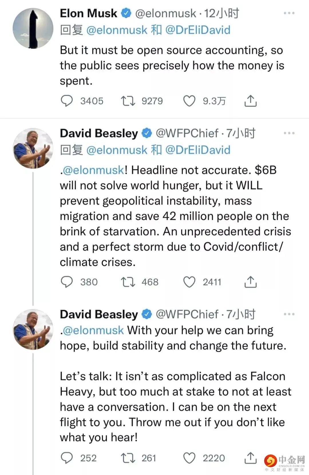 值得一提的是,上月19日,比斯利就曾在推特向马斯克“喊话”,一方面恭喜他夺得世界首富,另一方面呼吁他捐款。推文称:“为庆祝你的胜利,我方现为你提供一个毕生难求的机会——用66亿美元拯救4200万人。这项邀请很快会过期,毕竟人命关天。”