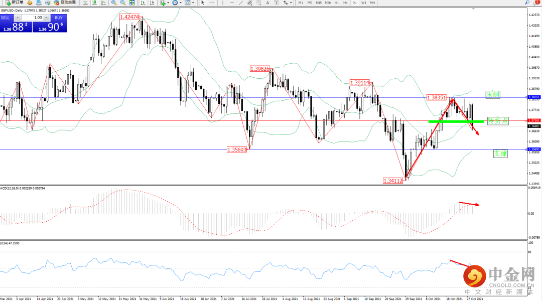 低位多头动力持续震荡上扬,高位抵达1.38351位置遇阻回撤,纠结于布林带指标中轨附近节点后有继续回撤下移迹象,布林带指标呈上行走势持续收口中,上方压制关注1.38351位置,低位支撑关注1.35693位置,关注中轨1.37161位置支撑节点,MACD指标处于0轴线上方多头区域维持整理平移,RSI指标处于多头区域窄幅整理回撤至50均衡线附近徘徊,如图: