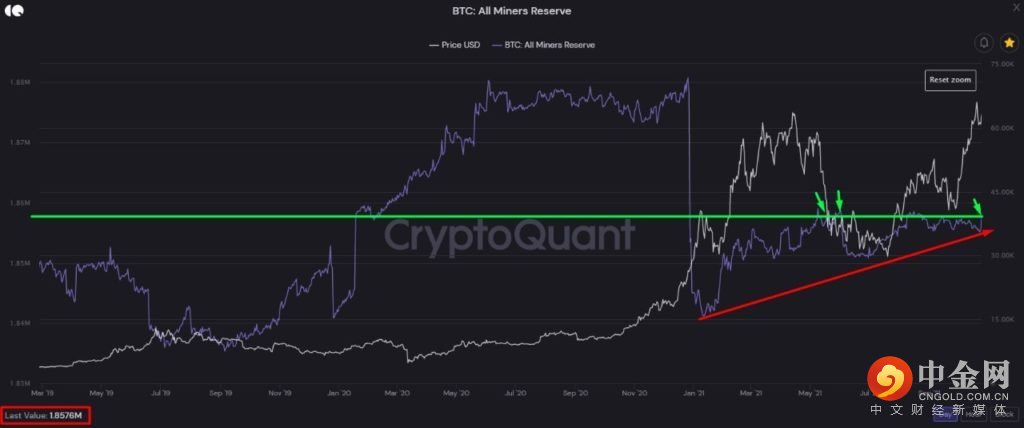 当 BTC 的价格跌至 60,000 美元左右时,BTC 矿工的储备开始飙升。
