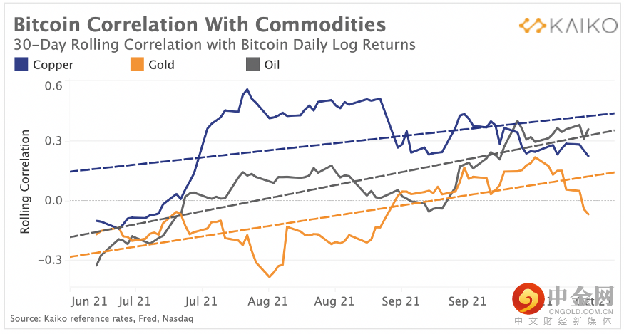 数据显示,近期BTC与大宗商品的相关性一直在攀升。自第三季度开始以来,BTC 与大宗商品的相关性——历史上在意外通胀时期表现良好——一直在上升。在下图中,请注意 BTC 与铜和石油的相关性自 9 月以来一直在增加。由于需求增长和创纪录的低库存,过去几周石油和铜价均上涨。