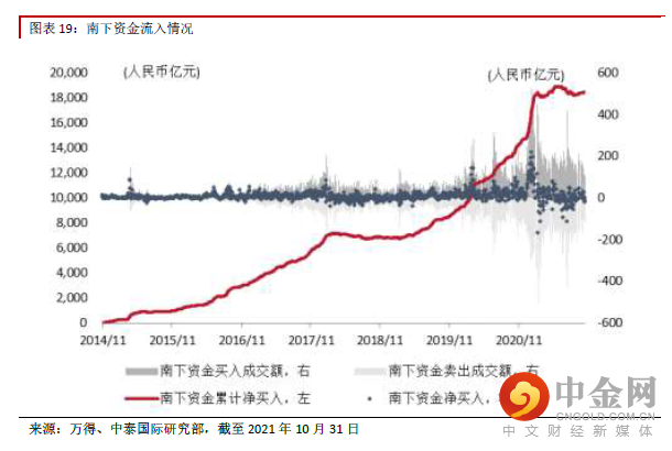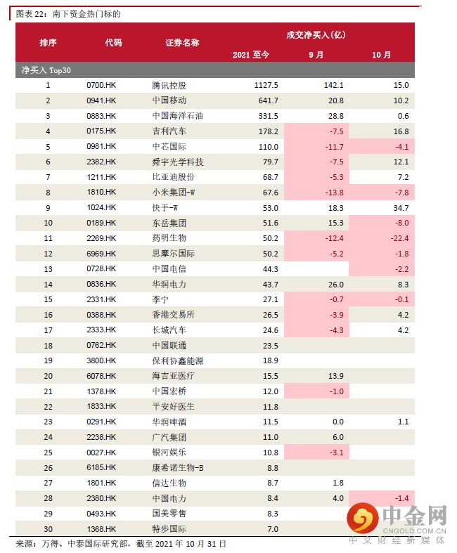 南下资金:互联网及汽车龙头获得关注南下资金10 月净流入80.8 亿元,日均净流入5.4 亿元,环比减少32%。同期北上资金日均净买入21.9 亿元,环比继续保持改善,仍然为连续净流入,好于南下资金。10 月南下资金日均成交额219.7 亿 元,占比10.3%,较上月下降1.5 个百分点。10 月南下资金对周期行业热度出现明显下降,如建设银 行(0939.HK)、东岳集团(0189.HK)、中国神华(1088.HK)等均出现了明显的净卖出。而TMT 龙 头,如美团-W(3690.HK)、快手-W(1024.HK)、腾讯控股(0700.HK)等,则继续获得南下资金布 局,呈现较大净买入。港股汽车龙头,如吉利汽车(0175.HK)、比亚迪股份(1211.HK)、长城汽车 (2333.HK)则从净卖出转为净买入。