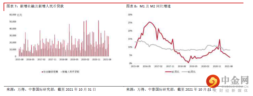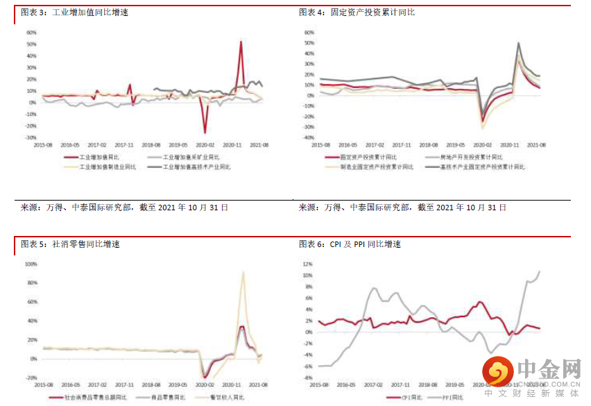 前9 月城镇固定资产投资累计同比增长7.3%,增速较上期下降1.6 个百分点。两年平均增速为3.8%,较上期下降0.2 个百分点。其中房地产开发投资同比增长8.8%,较前值回落2.1 个百分点。在房地产调控政策仍然未出现大的放松的情况下,房地产投资下行压力持续加大。未来需要对房地产政策走向继续保持谨慎。制造业投资同比增长14.8%,较前值回落0.9 个百分点,但9 月反弹较大,回升幅度超预期。主要集中在电气机械、器材制造业及医药制造业等,或与出口强劲有关。但随着需求减弱、成本增加,未来制造业企业预期或走弱,制造业投资压力上升。前9 月基础设施建设投资同比增长 1.5%,较前值回落1.4 个百分点,继续维持在低水平波动。年底前专项债会放量发行赶进度,但从专 项债发行到项目投资仍需要一定时间,基建投资改善或延后至年底,预计幅度不会过高。9 月社会消费品零售总额同比增长4.4%,增速较上期提高1.9 个百分点,环比出现改善。两年平均增 速3.8%,较受疫情影响较大的8 月有明显改善。但仍在低水平波动。9 月商品零售增长相对较好,但 汽车缺芯问题仍需等待时间来进一步消化,导致汽车销售同比继续下滑11.8%,拖累整体消费增速。预计芯片产能恢复传导至汽车销售后,汽车消费旺季或能够延迟到来。餐饮方面,9 月餐饮消费增速 同比上升5.5%,环比已恢复至正常水平。但消费整体来看,在目前疫情仍然不定期抬头,防疫措施仍 然不敢松懈的情况下,仍然需要一个较长的恢复周期。9 月CPI 同比增长0.7%,增速继续回落,主要仍受肉类价格持续走弱的影响。非食品价格则保持上升 趋势,显示内需复苏温和,总体价格水平保持平稳。但进入十月后蔬菜价格趋于上涨,生猪期货价格 大幅走高,未来CPI 或出现显著上行。9 月PPI 同比增长10.7%,增速进一步扩大,续创08 年以来新 高,主要仍受上游采掘工业高位延续,原料价格大幅上涨影响。随着国际大宗商品价格持续高位,我 国上游原料价格短期难以回落。在目前稳价保供的倾向下,能耗双控或有所放松。而随着四季度进入 采暖高峰季,能源供应偏紧或将延续,导致PPI 短期内持续高位。