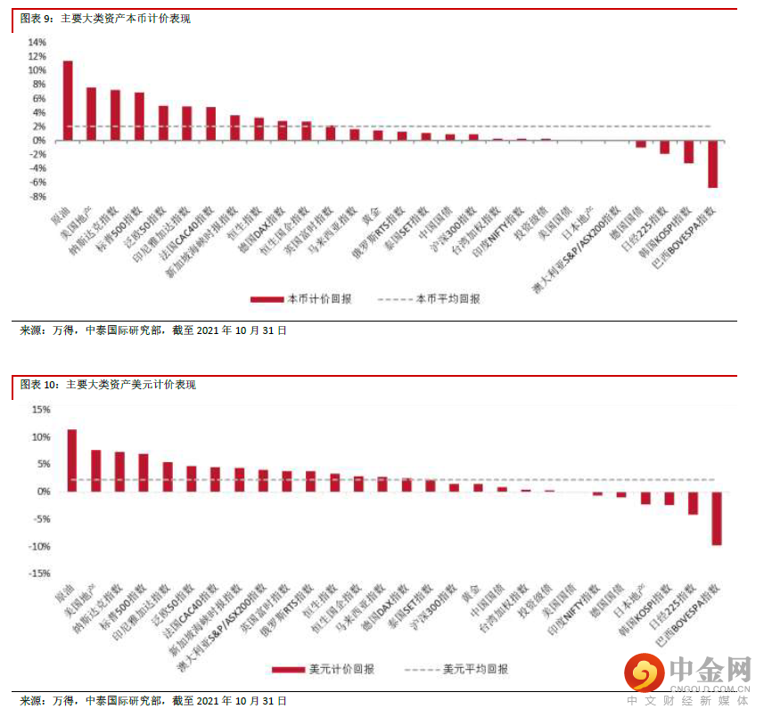 2021 年10 月,资金风险情绪有所改善,原油继续领涨主要大类资产。权益类资产也都出现不同程度复苏,发达市场再次整体跑赢新兴市场,其中美国市场领涨。美股三大股指中,纳指涨幅达到7.3%,跑赢标普500 及道指。港股市场在前期各种行业政策因素充分发酵后,呈现超跌反弹。以美元计,恒指上月反弹3.3%,国指反弹2.8%。A 股市场在房地产税改革试点等因素作用下,沪深300 指数以美元计仅小幅上涨1.5%。而油价则继续在经济不均衡的复苏下,上月继续大幅上涨11.4%。