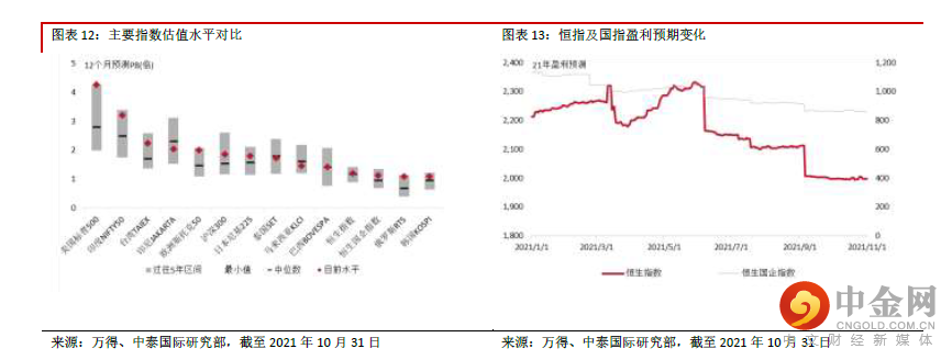 恒生指数目前12 个月预测估值在11.9 倍,经过上月的估值修复,估值水平环比出现明显提升,目前 已高于历史中位数。国企指数估值在9.8 倍,较历史中位数仍有一定距离,目前仍呈现偏高的情况。在全球来看,香港市场估值扩张后,估值地位并未明显改变,仍然偏低,但高于韩国、巴西及俄罗斯 市场。美股估值目前在21.7 倍,较上月出现回升,仍低于印度市场,但大幅高于过去5 年中值16.7 倍。除了马来西亚及巴西,目前多数全球主要市场估值均处在偏高位置。从PB 来看,恒指目前估值 已回升至历史中位数以上水平。