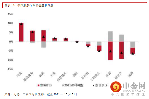 行业估值盈利分解:行业分化已现 中国股票分行业来看,10 月一级行业呈现涨跌互现,其中可选消费、通信服务、必需消费、工业、信 息技术出现上涨,涨幅分别达到9.8%、5.4%、2.7%、2.0%、1.8%。TMT 主要分布的消费、信息技术及 通信服务业均出现了明显的反弹,但主要受估值扩张带动。下跌行业中,医药、房地产、能源跌幅较 大,主要受房地产税改革试点及煤炭行业限价等因素影响,调整幅度较大。医药行业由于前期估值过 高,目前仍处在估值回调,资金流出的影响中,且CXO 龙头增速不及预期,也影响了行业情绪。