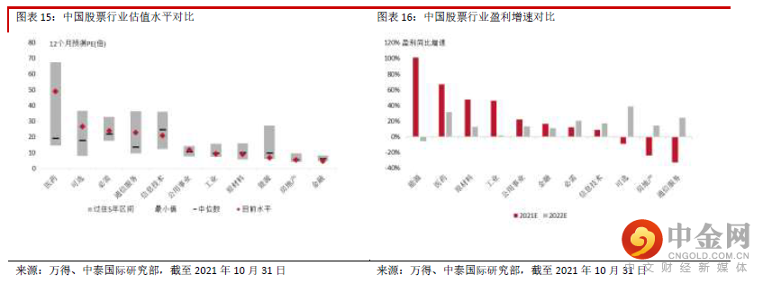 从行业估值来看,医疗保健、可选消费、通信服务估值已经降至75%分位数以下,信息技术估值已降 至历史中位数以下,必需消费估值继续保持在历史中位数附近。信息技术估值目前已经低于必需消费 及通信服务。周期行业整体估值仍然处在历史中位数水平,能源、金融、房地产估值继续在历史低 位。2021 年预测盈利增速较高的行业仍然是能源、医药、工业及原材料,且进一步提高,盈利增速分 别达到109.3%、65.2%、47.0%、43.2%。通信服务、房地产及可选消费业盈利预期增速有所改善,但 同比仍然下跌。