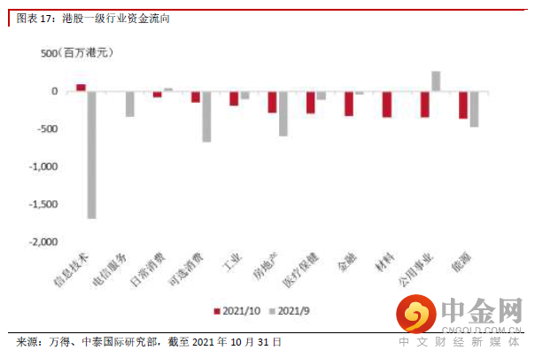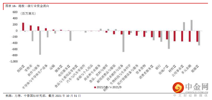 资金流向:资金流出的趋势未改10 月,随着港股基本面的边际走弱更加明显,虽然指数整体反弹,但资金流出的趋势未改。一级行业 多数出现资金净流出,其中能源、公用事业、材料业净流出幅度较大。仅信息技术呈现小幅净流入, 扭转了之前连续净流出的情况。24 个二级行业中,有8 个呈现净流入,主要集中在保险、零售业、软 件与服务等行业。16 个板块呈现净流出,其中,能源业净流出量最大,房地产、材料、公用事业、多 元金融也有较大净流出。