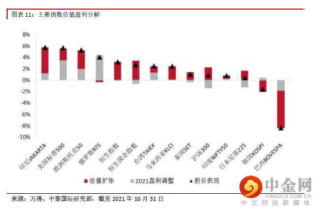 股指表现及估值盈利分解:估值超跌反弹,盈利预期走平 港股市场10 月估值呈现扩张,环比增加3.3%。主要由于前期多行业政策调整已在港股充分发酵,导 致港股估值出现超跌反弹。但另一方面,可以看到港股盈利预期基本走平,主要由于中国经济复苏边 际放缓,已逐渐反映至港股盈利预期。在叠加多地限电导致工业生产迟滞、原材料价格上涨挤压下游 工业企业利润、疫情反复使得多项经济活动仍未能恢复常态等多重因素下,预计港股盈利预期存在持 续恶化风险。美股市场10 月盈利预期及估值双双出现扩张,其中盈利预期环比增长3.5%,估值环比 扩张2.1%。