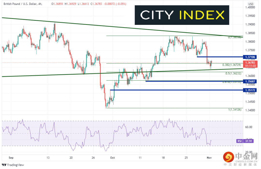 英镑/美元4小时图已自上述三角形的上轨下斜趋势线(绿色)回落至9月29日低点到10月20日高点行情的38.2%回档位,即1.3673附近,支撑位在周一低点,即三角形下轨上斜趋势线附近1.3642一线,然后是50%回档位1.3622和61.8%回档位兼水平支撑位1.3570附近。上周五以来的盘中水平阻力位在1.3710还有50天均线。再往上的阻力位在近期高点1.3834和200天均线1.3847。