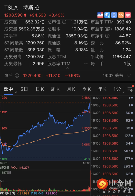 周一,特斯拉再度暴涨,收盘涨8.49%,连续四个交易日创新高。当天,特斯拉市值上涨946亿美元,约合6051亿人民币。