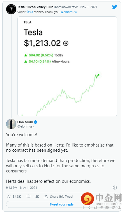 马斯克发推文表示,在近期特斯拉股价飙涨后,他想强调“特斯拉和赫兹公司之间尚未签署任何合同”。