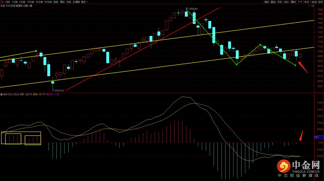 中证500目前出现了盘整筑底走势,后续行情中需要注意6888点的中枢支撑,在没有跌破之前大概率不会出现大幅度的回落走势,可以考虑逢低进行布局。