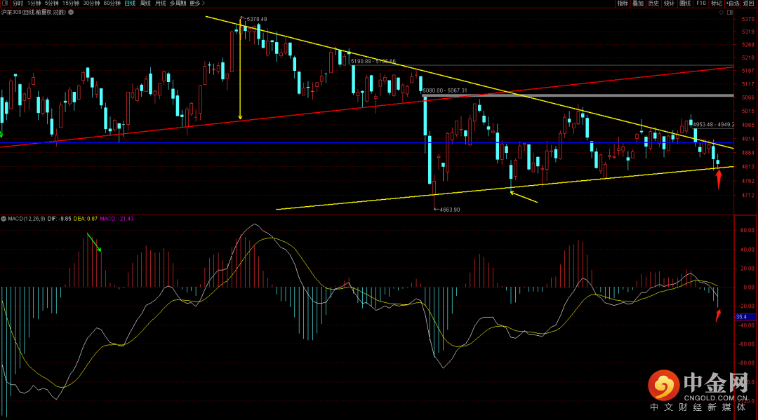 沪深300短期在没有跌破4769之前大概率会出现背驰反弹,短期关注前期上升趋势线的支撑,而上方短期强压大概率出现在4917附近,在没有突破这个位置之前大概率还无法向上发动攻击。