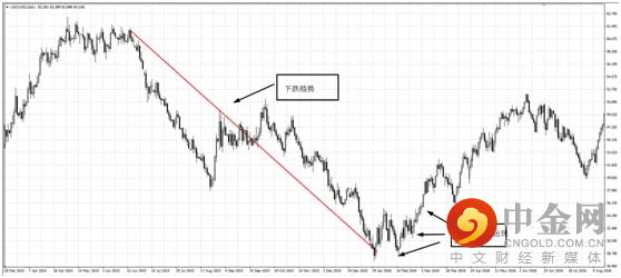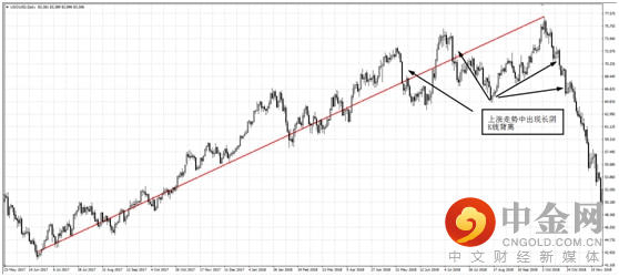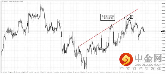 趋势K线背离:所谓趋势K线背离,是指K线图中,走势正朝某一方向正常运行时,突然出现一根有悖于原走势方向的强力度K线,价格在原走势方向上猛然遇到强有力的狙击,从而表现出的一种初级背离.这种背离就好比一支进攻中的常胜部队,突然间遭到了一次被对手迎头痛击的惨败,虽不敢据此断定攻守双方态势将因此改变,但也足以引起警惕.简单地说,趋势K线背离就是上涨行情中突然出现长阴K线,或下跌行情中突然出现长阳K线。这种背离方式是一种最初级、简单的背离,一眼即可识别,出现趋势K线背离,方面代表反趋势一方的力量突然增强,另方面也说明趋势一方的力量衰减。出现这种K线背离,就要加以重视,说明趋势一方的力量衰减.深入分析的必要。如图2-1所示,上涨行情中,多方一直处于进攻态势,空方虽小有抵抗,但总是节节败退.在这时期K线图上除了收出大量阳线外,只有少量小阴线点缀其间.