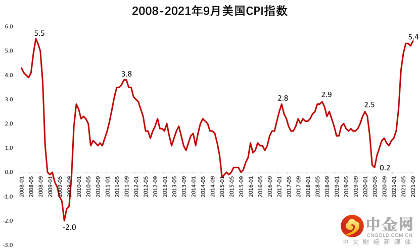 首先来看通货膨胀。10月公布的美国5年期盈亏平衡通胀率攀升逾9个基点至3.007%,为有纪录以来首次突破3%,远超美联储2%的长期通胀目标。另外,据美国劳动统计局数据,美国9月CPI年率升至5.4%,超出市场预期,已经触及到了2008年以来高点。
