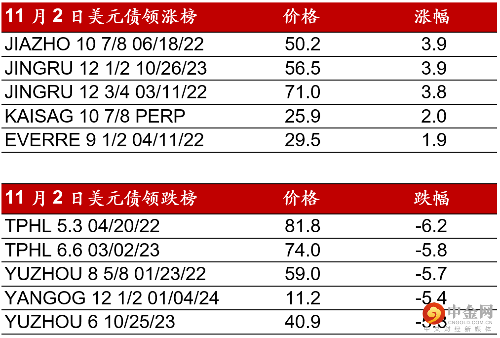 昨日(11月2日),中国高收益债券市场较为波动,整体情绪仍然较弱。早盘延续近日较弱情绪,大部分债券均见不同程度跌幅。时代早盘一度下跌至5-7pts,融创/旭辉/正荣下跌约3-5pts。禹洲/奥园也见较多卖盘,价格下跌幅度大。午后,部分债券在较多抄底买入和空头回补推动下有所回稳。时代较低点回升2-3pts,全日收跌约4pts,中骏/合景泰富/宝龙全日下跌约2.5pts,碧桂园回稳至全日收平。其他较好评级债券如世茂/旭辉/龙光收跌约1-2pts。工业板块如山东钢铁和复星国际有较好买盘。