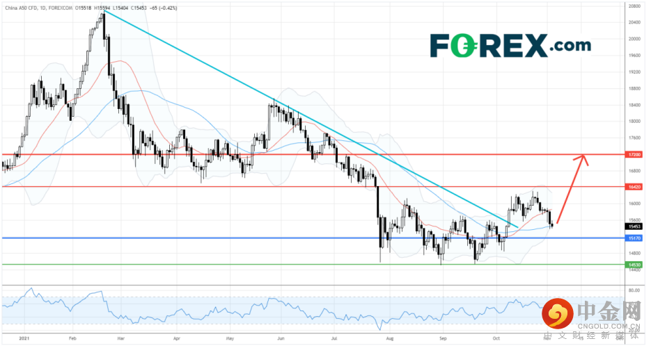 在日线图上,中国A50指数CFD上破了由今年高位拉出的下降趋势线后作出整固。目前,指数价格仍在测试50日均线。