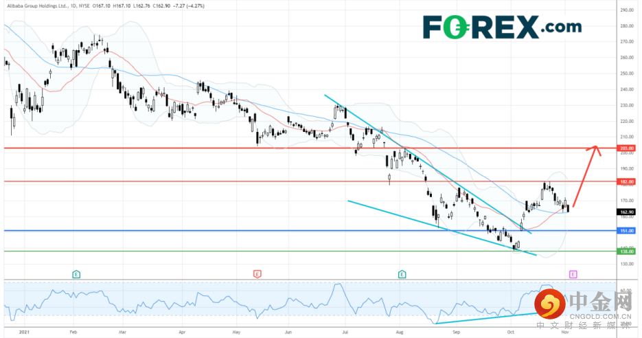 中国科技巨头 阿里巴巴 (美国预託证劵编号: BABA) 由10月初的低位反弹逾20%,目前市场预期中国对科技行业的监管已经接近尾声。
